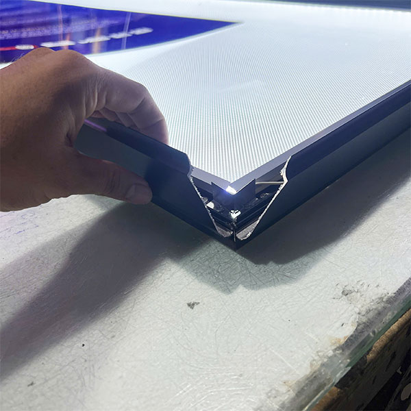 Hộp đèn siêu mỏng nắp bật 4cm là loại hộp đèn siêu mỏng có viền rộng 4cm, bật cạnh mặt trước để thay tranh. Hộp đèn này thường dùng để làm những poster điện có kích thước lớn hoặc làm các menu treo nghiêng.