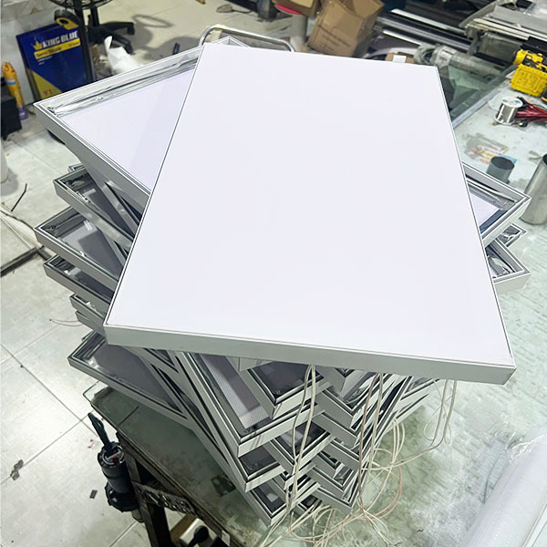 ⚠️ Lưu ý: Hộp đèn không viền nhét ron siêu mỏng không thích hợp để sử dụng ngoài trời và không thể làm kích thước vượt quá tấm mica dẫn sáng chuẩn (1,2m x 2,4m).