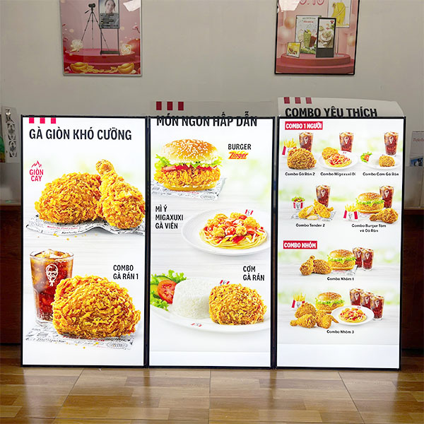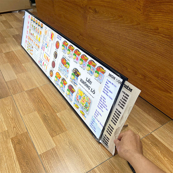 Sử dụng như một menu điện tử chiếu sáng, cho phép nhà hàng dễ dàng thay đổi thực đơn, giá cả hoặc chương trình ưu đãi chỉ bằng một thao tác rút tranh – giúp tối ưu trải nghiệm khách hàng và tiết kiệm chi phí in ấn.